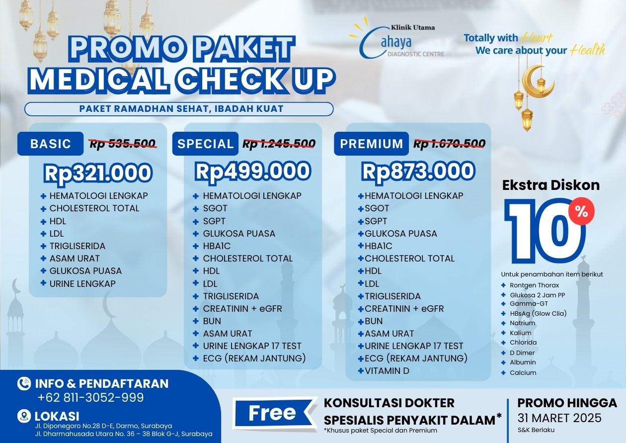 Dalam rangka mendukung kesehatan masyarakat selama bulan Ramadhan, Lab Cahaya Diagnostic Centre menghadirkan promo medical check-up spesial dengan berbagai paket menarik yang dapat disesuaikan dengan kebutuhan Anda: